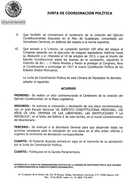 PRIMERO.- Se realice un acto conmemorando el Centenario de la creación del Ejército Constitucional, en la Plaza Legislativa. SEGUNDO.- Se autoriza la colocación y develación de una placa conmemorativa con un gran Escudo Nacional "AL EJÉRCITO CONSTITUCIONAL MEXICANO 100 AÑOS DE LEAL DEFENSA DE LAS LIBERTADES, LAS INSTITUCIONES Y LA REPÚBLICA", en el lobby del Edificio E de este recinto, el mural conmemorativo del Bicentenario. TERCERO.- Se instruye a la Secretaría General para que desarrolle todas las acciones necesarias para la colocación de una placa en el sitio antes referido y organice la cereminia de develación correspondiente. CUARTO.- Publíquese en la Gaceta Parlamentaria. |