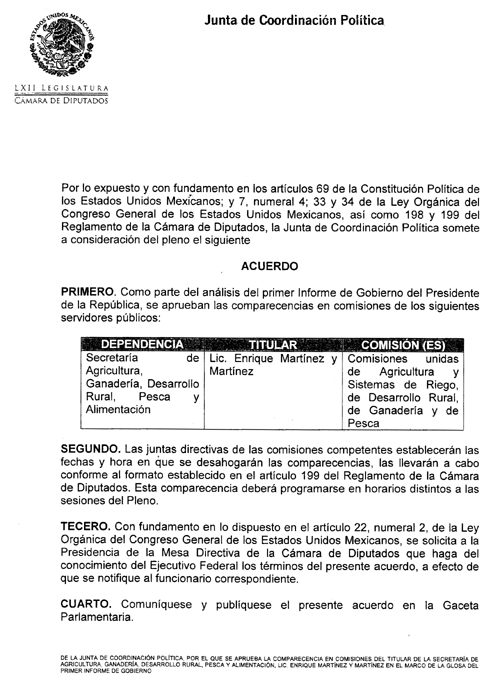 PRIMERO.- Como parte del análisis del Primer Informe de Gobierno del Presidente de la República, se aprueban las comparencencias en comisiones de los siguientes servidores públicos: Lic. Enrique Martínez y Martínez, Secretario de Agricultura, Ganadería, Desarrollo Rural, Pesca y Alimentación, ante las comisiones unidas de Agricultura y Sistemas de Riego y de Desarrollo Rural, y de Ganadería y de Pesac. SEGUNDO.- Las juntas directivas de las comisiones competentes establecerán las fechas y horas en que se desahogarán las comparecencias se llevarán a cabo conforme al formato establecido en el artículo 199 del Reglamento de la Cámara de Diputados. Esta comparecencia deberá programarse en horarios distintos a las sesiones del pleno. TERCERO.- Con fundamento en lo dispuesto en el artículo 22, numeral 2, de la Ley Orgánica del Congreso General de los Estados Unidos Mexicanos, se solicita a la Presidencia de la Mesa Directiva de la Cámara de Diputados que haga del conocomiento del Ejecutivo Federal los términos del presente acuerdo, a efecto que notifique al funcionario correspondiente. CUARTO.- Comuníquese y publíquese el presente acuerdo en la Gaceta Parlamentaria. |